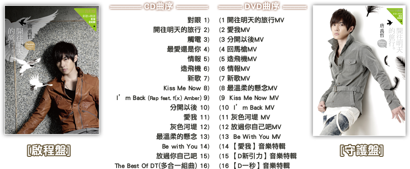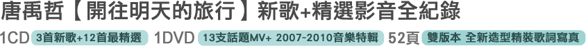在累積了三張精采的作品之後,唐禹哲從初出道的青澀偶像,蛻變成越來越見自信魅力的輕熟男人,這樣的轉變完整地呈現在他歷來的作品中,也因此,2011年唐禹哲即將推出名為【開往明天的旅行 (新歌+精選影音全紀錄)】的精選輯。