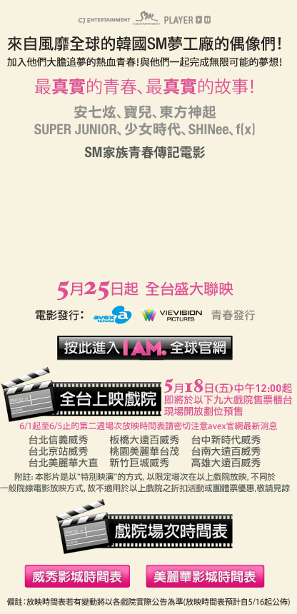 眾所矚目的「I AM.-SM家族青春傳記電影」將於5/25(五)在台上映,而且令人驚喜的是台灣這次領先了韓國的上映日期,所以台灣的歌迷朋友們可以搶先在全台灣的各大城市觀賞到這部SM家族精采的大電影! |